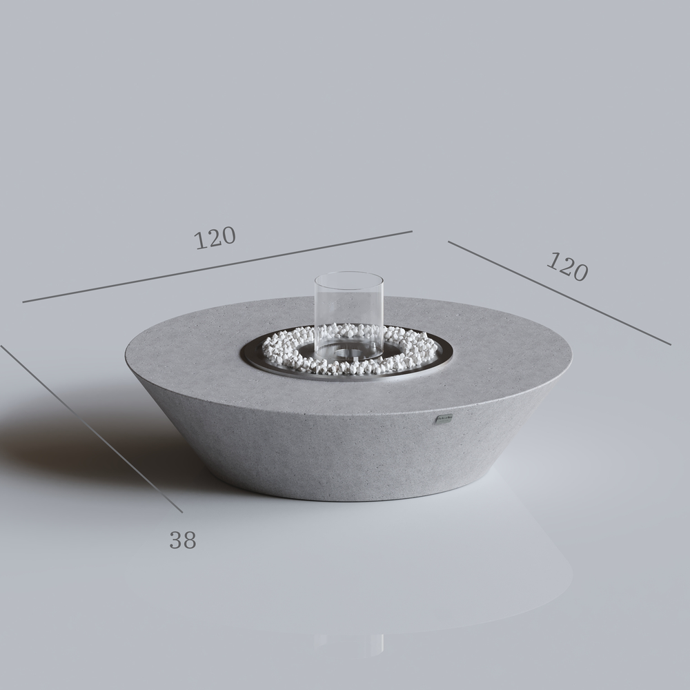 BLAZE beton ateş çukuru, yuvarlak ve alçak formuyla yaşam alanlarına minimalist bir şıklık katar. 120 cm geniş çapı ve 30 cm yüksekliği sayesinde bahçe, teras ve otel açık alanlarında sofistike bir atmosfer yaratır.